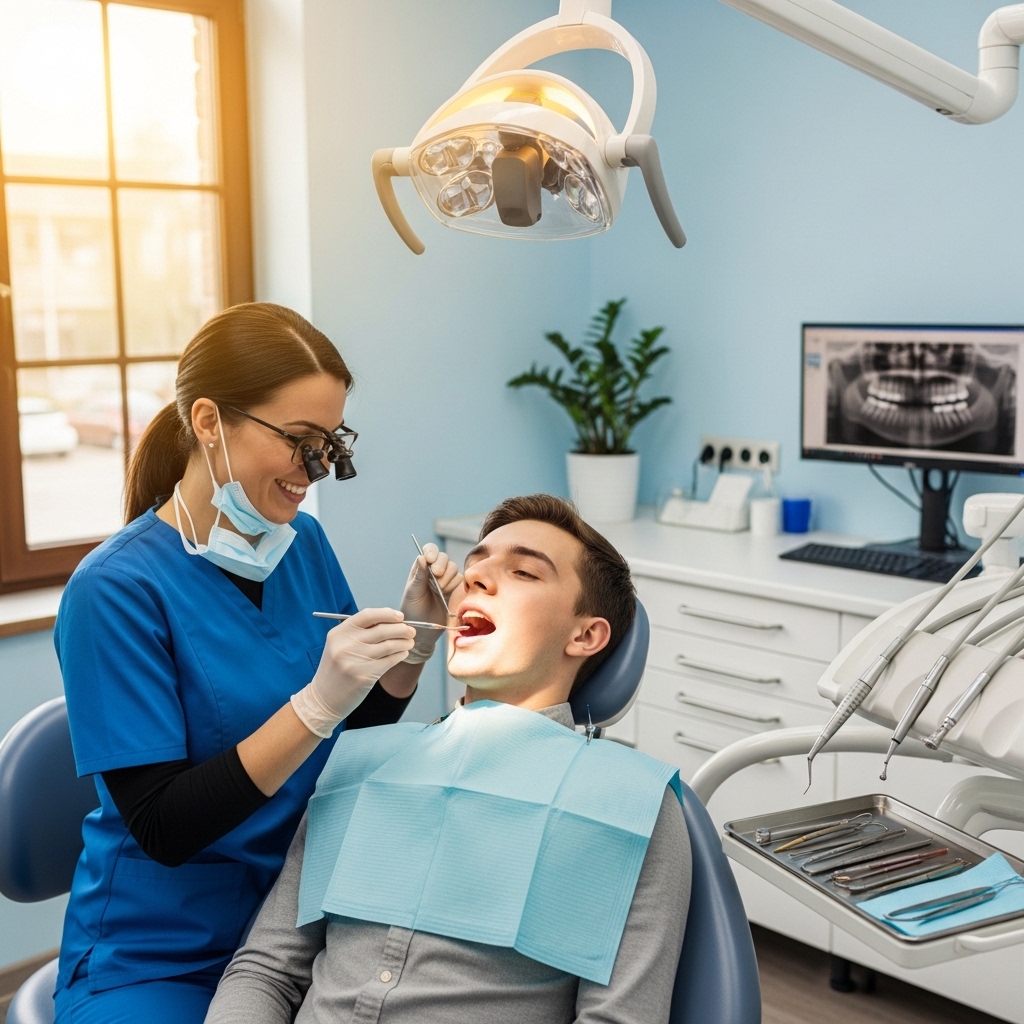Regular dental exam to monitor oral health and prevent problems. Dentists check teeth, gums, bite, and oral hygiene habits.